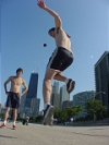 There were a lot of good shots from this set but this is definately my favorite. I just like how everything came together here, the pose is dynamic and the angle of the shot seems to bring more sense of height in Reile's jump. I also like how the Hancock Tower is framed by the 2 figures in the foreground and that the footbag is clearly in view. My only complaint would be that the bag has little detail and just looks like a hole in the photo. Photo by Alex "Zeke" Ibardaloza.