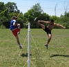 Midwest Regionals 2002. We at CIC have an inherent tendancy to jump when we have nothing else to do. We jump over each other, over obstacles on the sidewalk, over the hoods of cars, off of rooftops, or just jump kick each other. Tim did not trust me enough to move any closer than he already was, still, its a fun picture. Photo by Eric Reile.