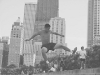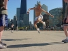 There were a lot of good shots from this set but this is definately my favorite. I just like how everything came together here, the pose is dynamic and the angle of the shot seems to bring more sense of height in Reile's jump. I also like how the Hancock Tower is framed by the 2 figures in the foreground and that the footbag is clearly in view. My only complaint would be that the bag has little detail and just looks like a hole in the photo. Photo by Alex "Zeke" Ibardaloza.