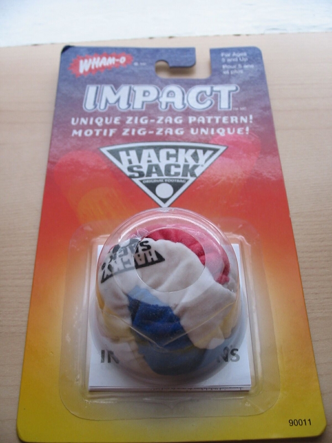 This is a 2001 Impact Hacky Sack still in it's original packaging. It's made up of 3 panel, the large white panel loops around the smaller blue and red panels.Photo by Reile.