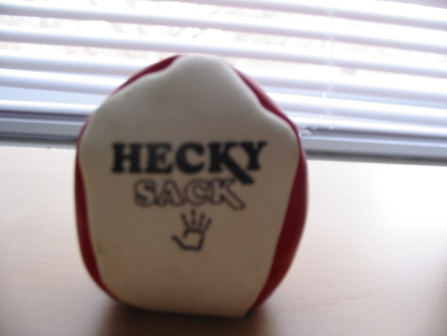 Not an actual Hacky Sack, the Hecky Sack is a promotional footbag given out by a BBQ resteraunt near my work. The back of the bag says "Redeem for 10% off @ Hecky's" :-)Photo by Reile.