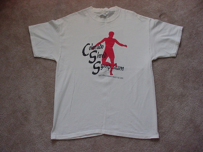 The saving grace of this shirt is the silhouette of the shredder creating the number 4, and that he's clipper stalling the dot of the i in symposium. Other than that I don't like this shirt all that much.