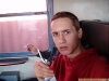 Gy?rgy Gősi, alias Lurko looks a bit tired on the train. Photo by Unknown.