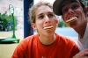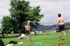 Gricha and Greg from "Rein n'est hacky" footbag club Paris, maxing and relaxing at Footjam 2004. Photo by Andrew T. Grant.