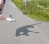 A little visitor trying to kick the bag into the hole in the wall. Photo by Ilkka Malin.